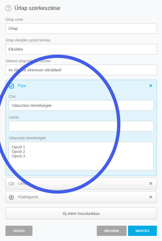 Nézzük a többi elem beállítási lehetőségeit. Kattintsunk a "Lenyíló" elemre. Ezt a típusú elemet akkor használhatjuk, ha azt szeretnénk, hogy látogatónk több lehetőség közül kizárólag egyet tudjon kiválasztani. Az előbbiekhez hasonlóan adjuk meg a mező címét és leírását.